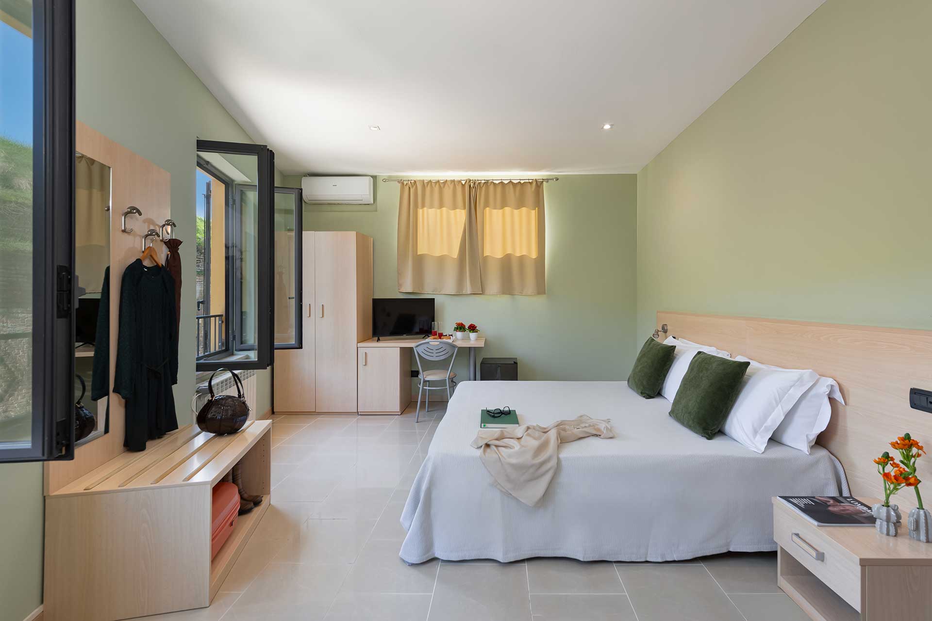 Silenziosa, confortevole, la camera matrimoniale accoglie il riposo su materassi di dimensioni generose e lenzuola candide.